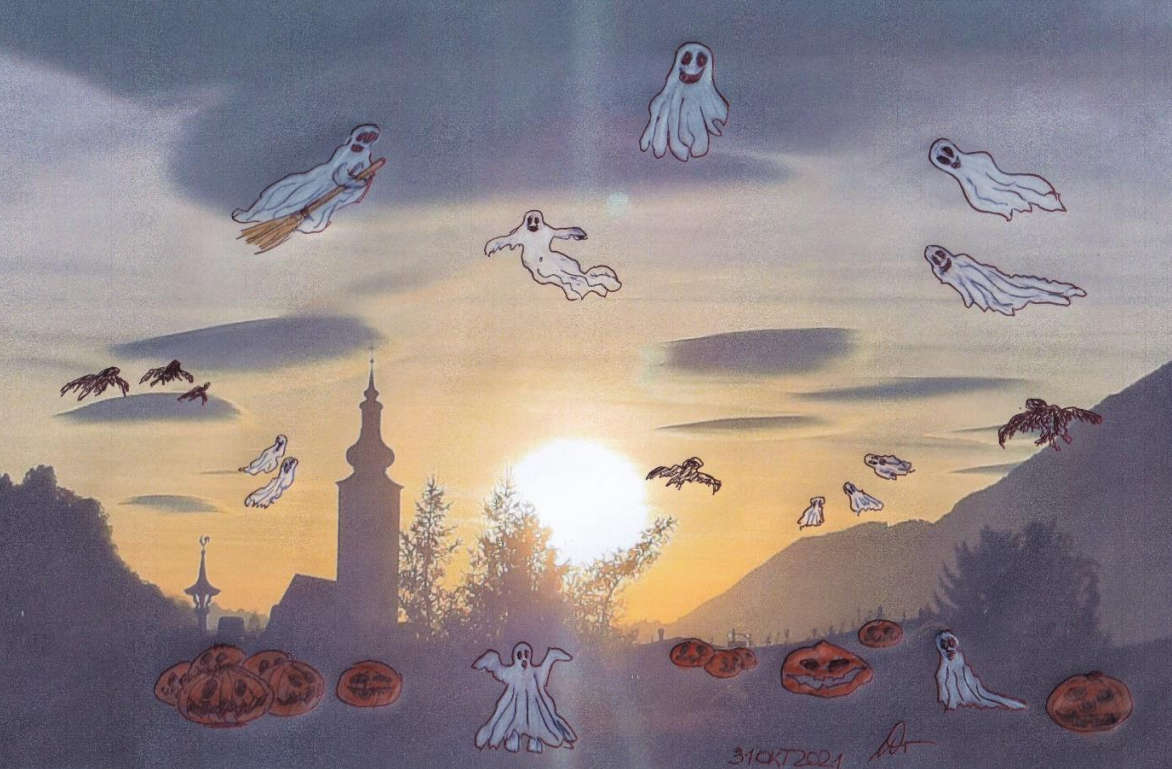 Letztens wurde ich eingeladen zu einer Halloweenparty. Na Gut dachte ich mir. Dann will ich auch dabei sein. Jetzt wusste ich aber nicht so richtig, wie so eine Party vor sich geht und was „in“ ist und was nicht gutiert wird. Auf jeden Fall wollte ich kein doofes Erscheinungsbild abgeben. Und da ist mir der Besen eingefallen, mit dem man durch die Lüfte fliegen kann. Und ich habe einen gebastelt. Das war ein ganz Alter aus dem hintersten Loch im Keller. Der hat am besten funktioniert. Und ab in die Lüfte und mit dabei sein. Das Alte hat schon was! Und man kann mich sehen links in der oberen Bildhälfte.