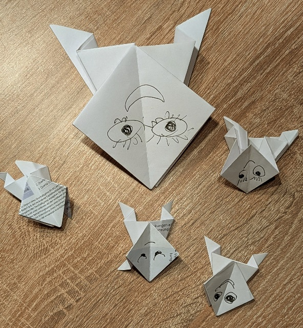 Der Josef, mein Sitznachbar, hat an dieser Aktion Interesse gefunden. Animiert und ermuntert habe ich auch noch einen Frosch gefaltet. Mit meiner Anleitung hat nun auch der Josef einen weiteren Frosch ins Leben gerufen. Die Falterei ist eine angenehme Möglichkeit zur Aufrechterhaltung der Konzentration. Das Meeting ist weitergelaufen mit Wichtigtuereien auf dem Rednerpult. Nun sind die beiden Frösche bereit zur weiteren Vermehrung. Zu zweit geht das. Eine Seite wird in der Mitte geteilt und daraus sind zwei kleine Nachwuchsfrösche entstanden. Diese Strategie ist so erfolgversprechend, dass wir noch eine Seite geviertelt haben und noch weitere vier Nachkommen haben die Familie vervollständigt. Der Kranich hat zugesehen und mit den Flügeln gewackelt.