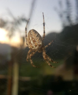 Und eigentlich sind sie schön. Vor allem dann, wenn sie von der Abendsonne angeleuchtet werden und die Netze zu leuchten beginnen. Dann entsteht ein Verständnis, dass es sich um Kunstwerke handelt. Und die Spinne sitzt mit stoischer Ruhe in der Mitte des Netzes und wartet geduldig auf Beute. So nach und nach ist der Ekel verschwunden und ich erkannt habe, dass die Spinnen keine Gefahr darstellen. Dann bin ich neugierig geworden.