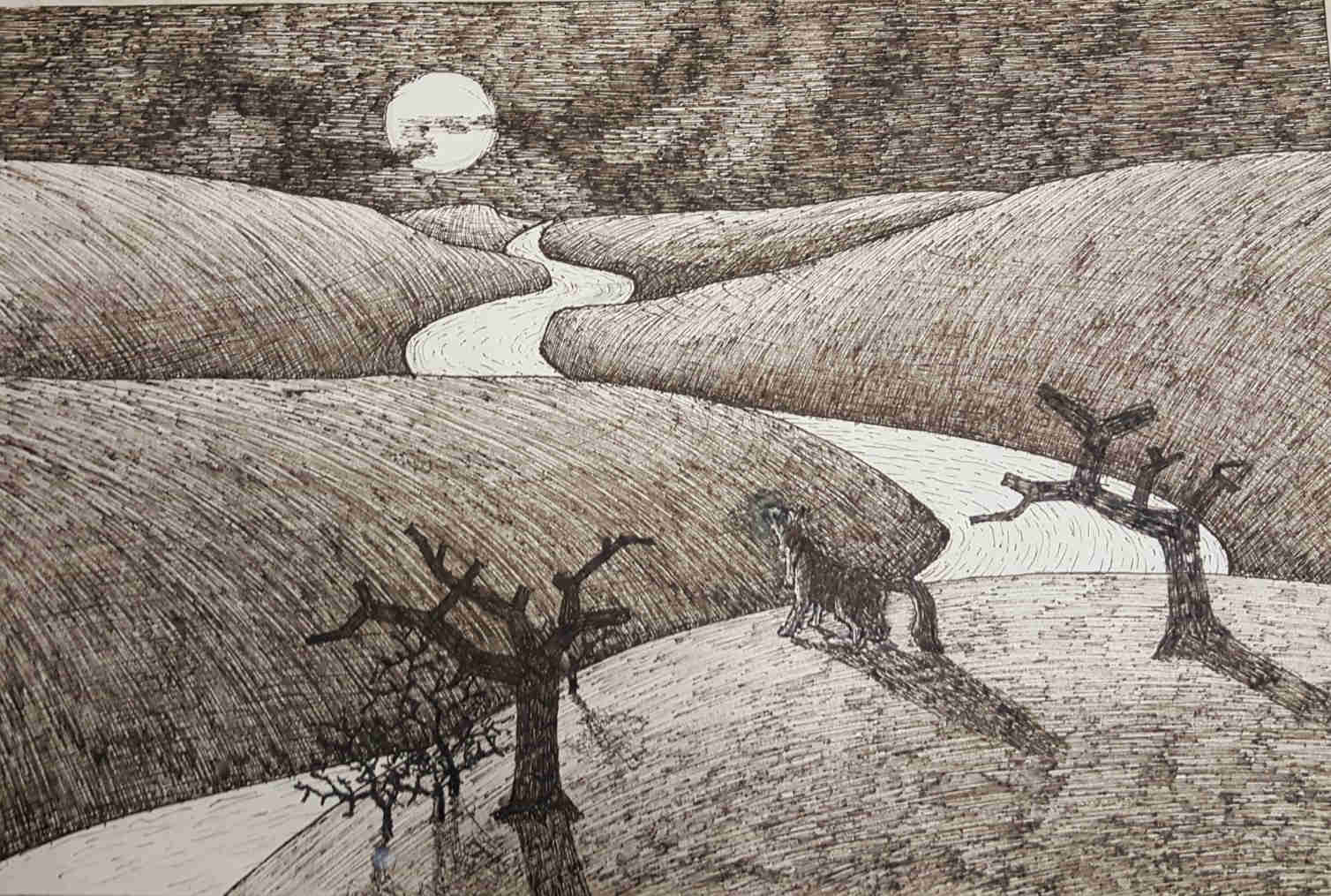 … von einem Hügel schweift der Blick weit ins Land. Ein Fluss bahnt sich seinen Weg durch sanfte Hügel. Wiesen und Wälder wechseln sich ab. Beleuchtet wird die Szene vom tiefstehenden Mond, sodass der Fluss silbern glänzt und die Bäume lange Schatten werfen. In ganz weiter Ferne verliert sich die Landschaft im Dunkel der Nacht. Auf dem Hügel im Vordergrund stehen Büsche und einzelne Bäume. Der Wind peitscht die Baumwipfel hin und her und entlockt ihnen unheimliche Töne. Neben einem Strauch steht ein zottiger Wolf. Er steht geduckt, wie zum Sprung bereit. Das dicke struppige Fell verdeckt nur ungenügend die kräftigen Muskeln. Die Rute klemmt zwischen den Hinterläufen. Seine Nackenhaare sind gesträubt. Die Schnauze ist gegen den Mond gerichtet. Er möchte am liebsten laut losheulen, einstimmen in das Lied der vom Wind gequälten Bäume. Aber etwas hält ihn zurück. Alle seine Muskeln sind gespannt und er möchte ... er möchte vieles ... am liebsten aber ganz laut losheulen ...