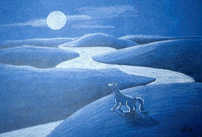 ... the eye roams far into the land from a hill. A river makes ista way through gentle hills. Patures and woods alternate.The scene is illuminated by the low moon, so that the river shines silvery and the trees cast long shadows. Far, far away the landscape is lost in the darkness oft he night. On the hill in the foreground are bushes and now and then a tree. The wind whips the treetops to and fro and elicits weird tones. A shaggy wolf is standing near a shrub. He is ducking down ready to jump. The thick, shaggy coat barely coverst he strong muscles. The switch is stuck between the hind-legs. His neck-hairs are standing on end. The snoat is turned tot he moon. He would like to start howling very loudly, tune into the song oft he trees tormented by the wind. But something is stopping him. All his muscles are strained and he`d like ... he`d like a lot ... but above all he wants to start howling very loudly ...
